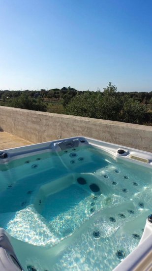 Sali sul solarium tramite la scala esterna e ti ritroverai sospeso tra cielo e natura. Qui una vasca idromassaggio professionale trasforma ogni tramonto in un rituale di benessere: un calice di vino, la brezza leggera della campagna, i colori del cielo che si fondono con gli ulivi. È il luogo perfetto per vivere la Puglia più autentica, ma con un tocco di lusso che rende ogni giornata speciale.