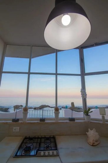 L’abitazione si sviluppa su 580 mq interni distribuiti su due livelli, dove gli spazi respirano grazie a grandi superfici vetrate che incorniciano l’azzurro e lasciano entrare il ritmo naturale delle onde. Il piano principale accoglie tre camere da letto e un’ampia zona giorno scenografica, pensata per mettere al centro il mare in ogni momento della giornata. La cucina panoramica in vetro, sospesa come un ponte trasparente, regala al vivere quotidiano un privilegio raro: cucinare con il mare di fronte, come se si fosse a bordo di uno yacht privato.