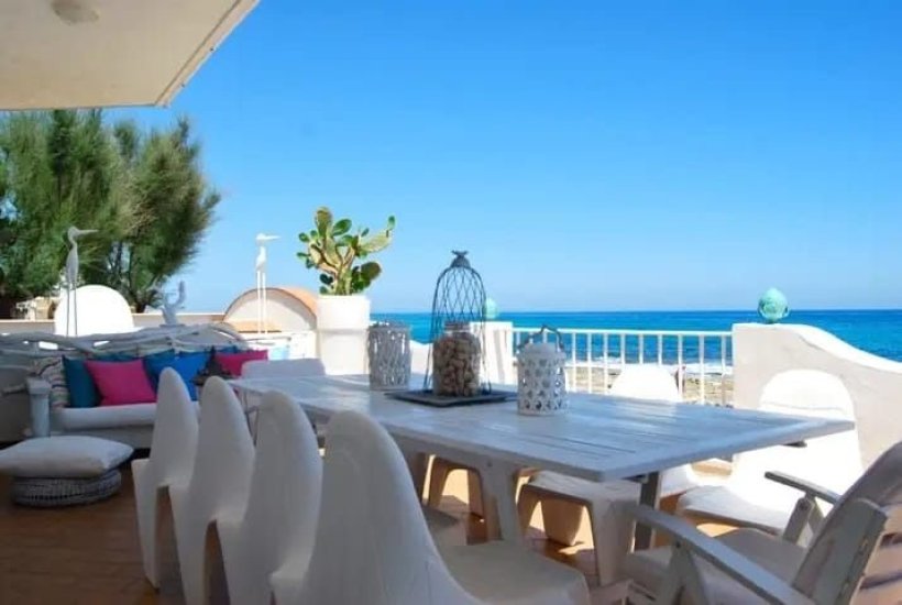 All’esterno, il paesaggio diventa architettura. La terrazza si apre come una platea privata sul mare, con un’elegante area dining fronte acqua, perfetta per colazioni sospese nel silenzio e cene illuminate dai tramonti rosati della Puglia. Da qui, un cancello esclusivo conduce direttamente agli scogli, permettendo un accesso privilegiato e unico al mare.