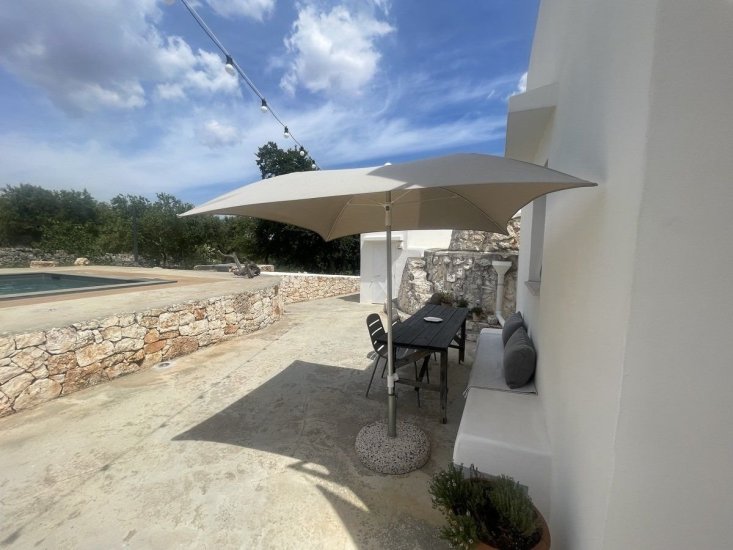 All’esterno, la scena è semplicemente iconica. Un ampio pergolato diventa il salotto estivo perfetto per pranzi, cene e momenti di relax, mentre la piscina privata, circondata da una raffinata zona solarium, si inserisce con naturalezza nel paesaggio rurale. Qui, il tempo sembra rallentare, accompagnato dai profumi della macchia mediterranea e dalla luce dorata tipica di Ostuni.