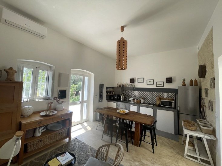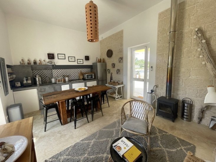 La residenza nasce da un trullo saraceno ampliato, oggi completamente ristrutturato con un linguaggio architettonico raffinato e coerente, dove materiali moderni e tradizione pugliese convivono in perfetta armonia. Gli interni si aprono su un luminoso soggiorno-pranzo con cucina a vista completamente attrezzata, uno spazio arioso e accogliente che dialoga con l’esterno. La zona notte della prima unità ospita una camera da letto matrimoniale, una camera singola e un bagno elegante, tutti caratterizzati da finiture contemporanee e atmosfere rilassanti.