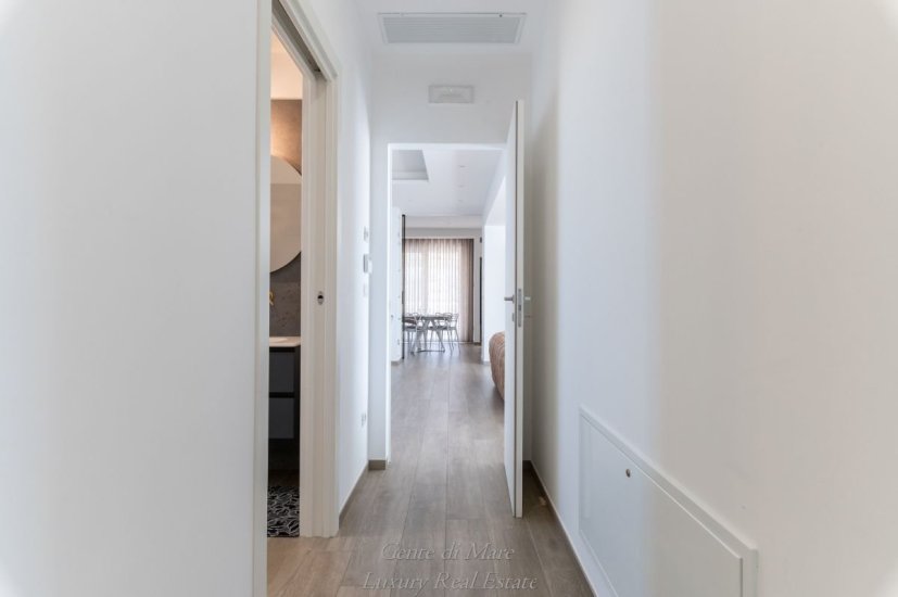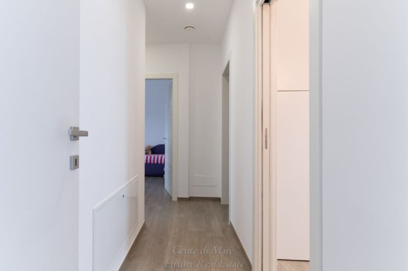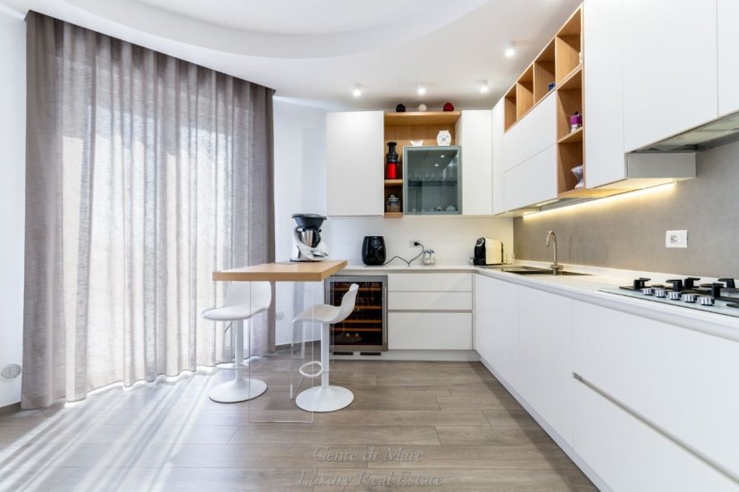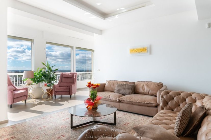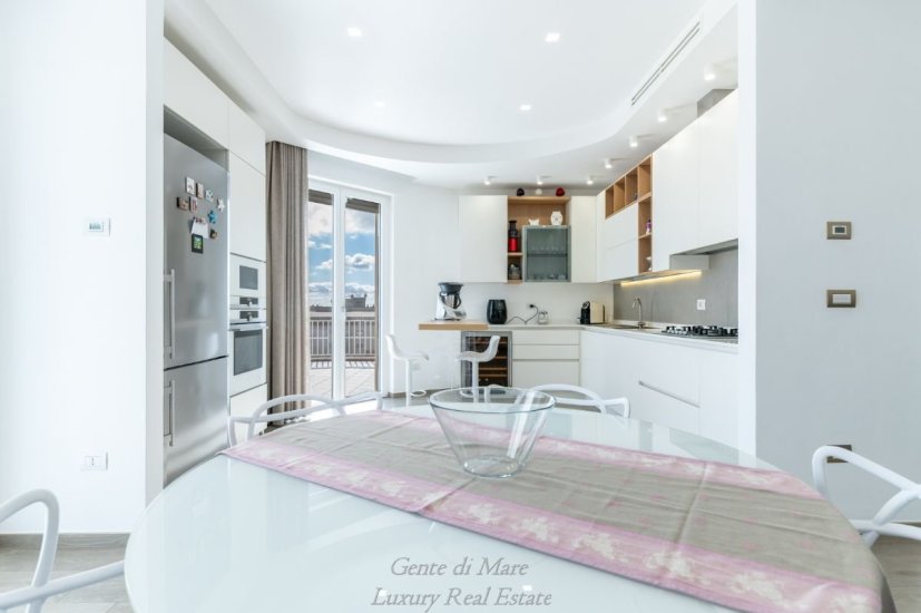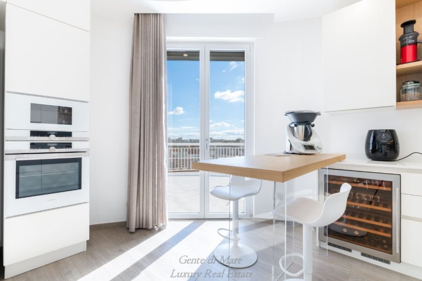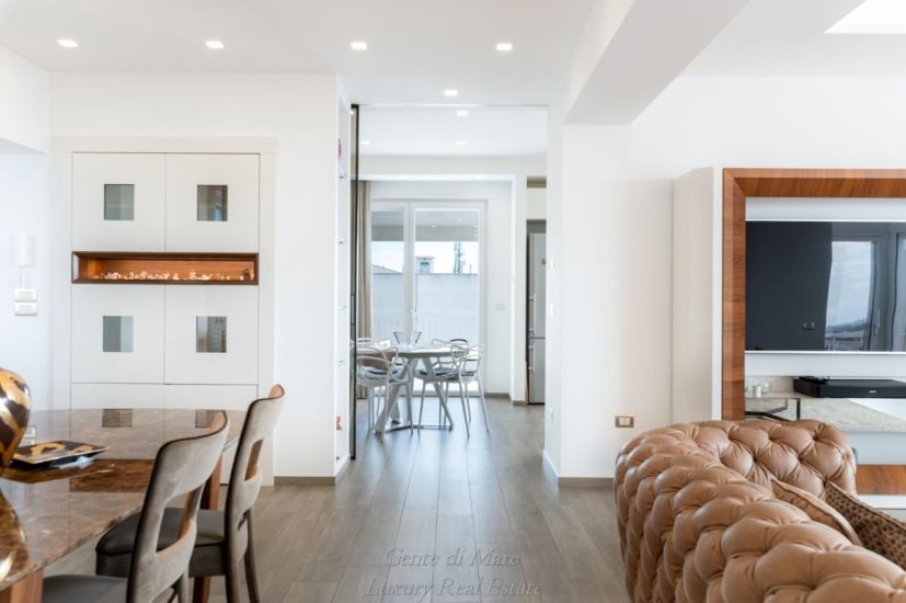Gli interni si sviluppano su una superficie di circa 180 mq, completamente ripensati con un progetto raffinato e contemporaneo. Il grande soggiorno è il cuore scenografico della casa, con affaccio diretto sull’attico verandato, uno spazio luminoso e riservato, protetto da serrande regolabili, ideale per vivere il panorama in ogni stagione. La cucina ampia e conviviale, anch’essa con affaccio sull’attico, è pensata per chi ama ricevere e vivere la casa con naturalezza.
