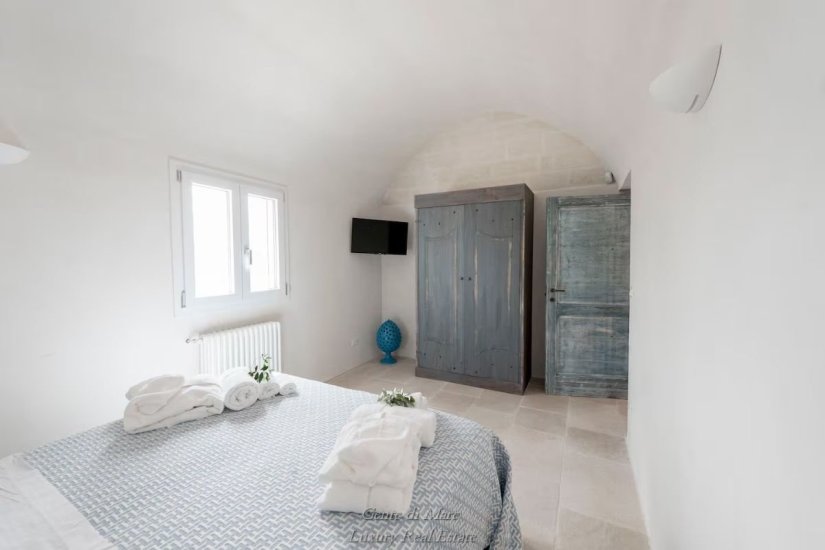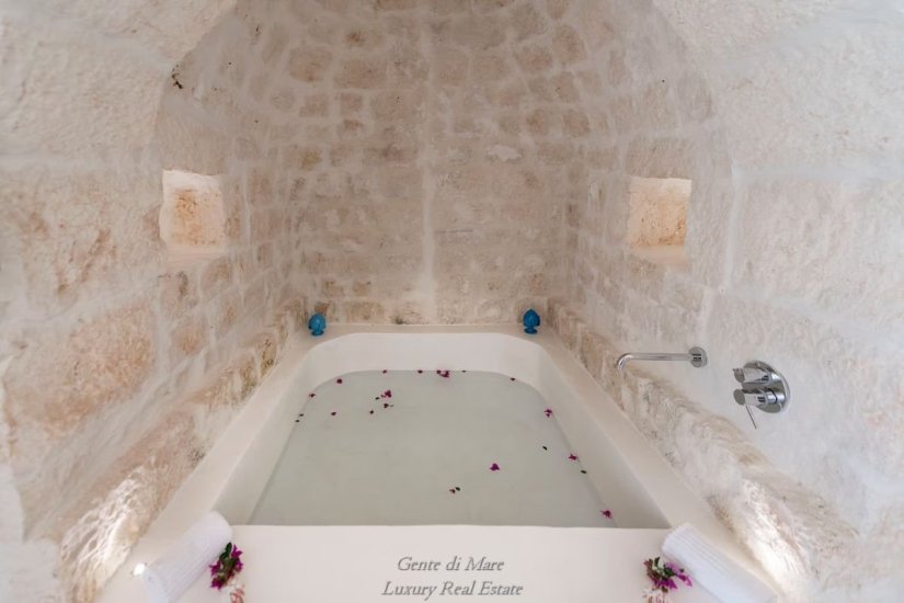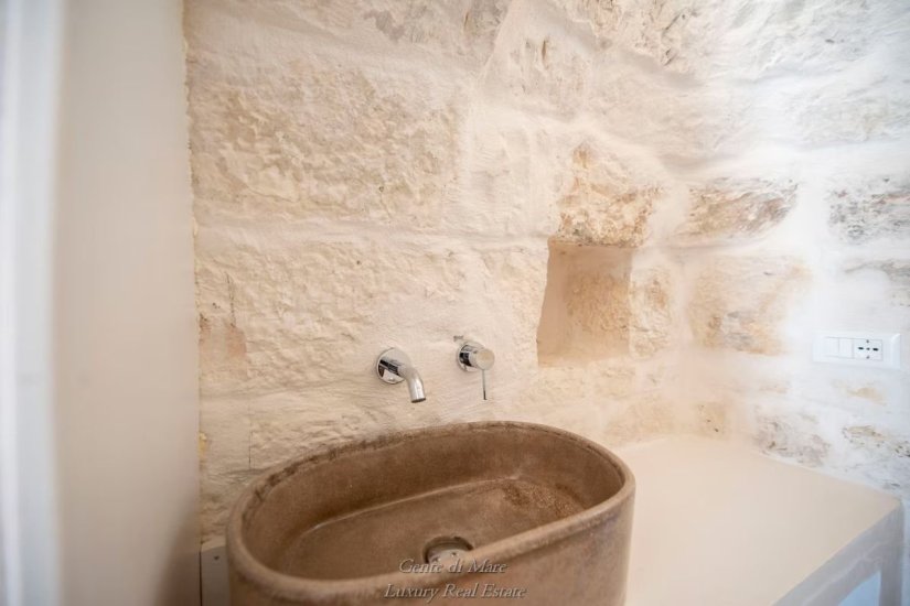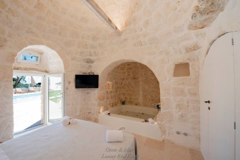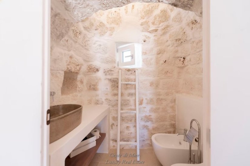 Accanto alla villa si trova un antico trullo di oltre 100 anni, restaurato con cura per preservarne l’autenticità. All’interno conserva dettagli affascinanti della tradizione, come la vasca da bagno in pietra, il portone originale e i caratteristici gradini laterali che un tempo venivano utilizzati per l’essiccazione di fichi e legumi. Gli stessi gradini conducono alla sommità del trullo, da cui si può ammirare una splendida vista panoramica sulla vallata fino al mare. Il trullo ospita una camera matrimoniale con ampia vasca da bagno e bagno privato, creando un ambiente intimo e suggestivo.
