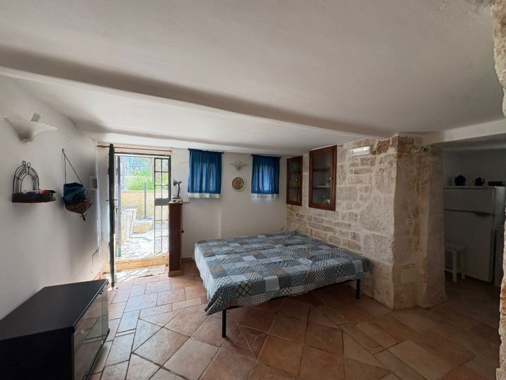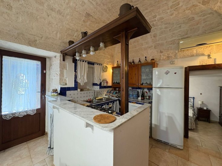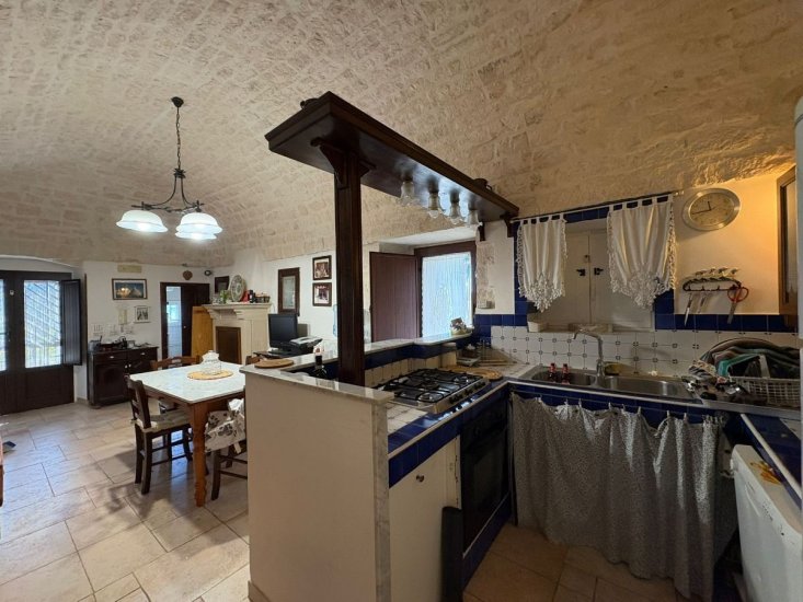 GLI INTERNI: La proprietà si sviluppa su circa 250 mq tra trulli e lamie. Il corpo principale accoglie un ampio open space luminoso, con cucina in muratura e tripla uscita esterna, tre camere da letto e due bagni. Al piano sottostante, sempre con luce naturale, si trovano due bilocali indipendenti, ciascuno con zona giorno/notte, angolo cottura, bagno e spazi esterni privati.