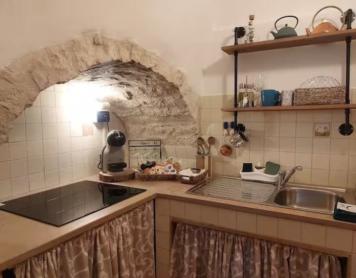 GLI INTERNI: Un unico ambiente accogliente e luminoso dove la pietra a vista è protagonista. La zona living ospita un letto matrimoniale comodissimo, un caratteristico armadio scavato nella roccia, area pranzo con TV e un affascinante camino originale in pietra. La cucina è completa di tutto, inclusi frigorifero e macchina per il caffè. Il bagno, pratico e tipico, dispone di doccia, bidet, wc, lavabo e phon.
